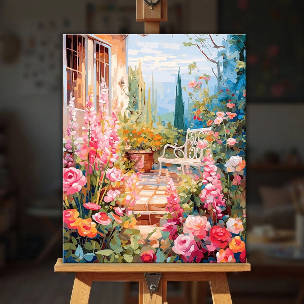 Un Lugar Tranquilo para Sentarse es un apacible kit de pintura por números para adultos, inspirado en un rincón soleado de jardín, lleno de flores y la suave luz del atardecer. El acogedor banco, el cálido sendero de piedra y los colores suaves crean una escena tranquila y acogedora que invita a la calma, la tranquilidad y la tranquilidad.