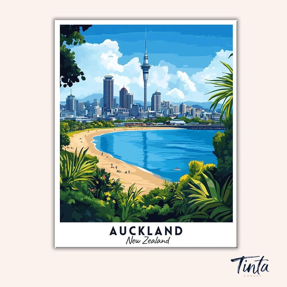 Captura la belleza natural y la energía moderna de Nueva Zelanda con este kit de pintura por números para pósteres de viaje de Auckland. La obra muestra el horizonte de Auckland elevándose tras una tranquila bahía de arena, con la Sky Tower elevándose sobre aguas azules, exuberante vegetación y soleados senderos costeros.