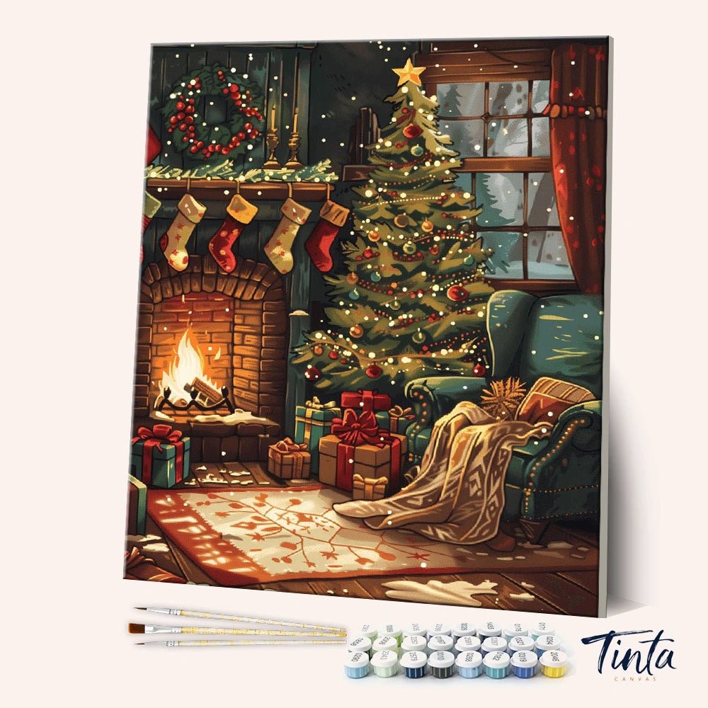 Navidad junto al fuego es un cálido y acogedor kit de pintura por números para adultos, inspirado en una tranquila noche navideña en casa. Una chimenea encendida, un árbol de Navidad decorado, mantas suaves y regalos envueltos crean una escena llena de comodidad, nostalgia y tranquilidad festiva.
