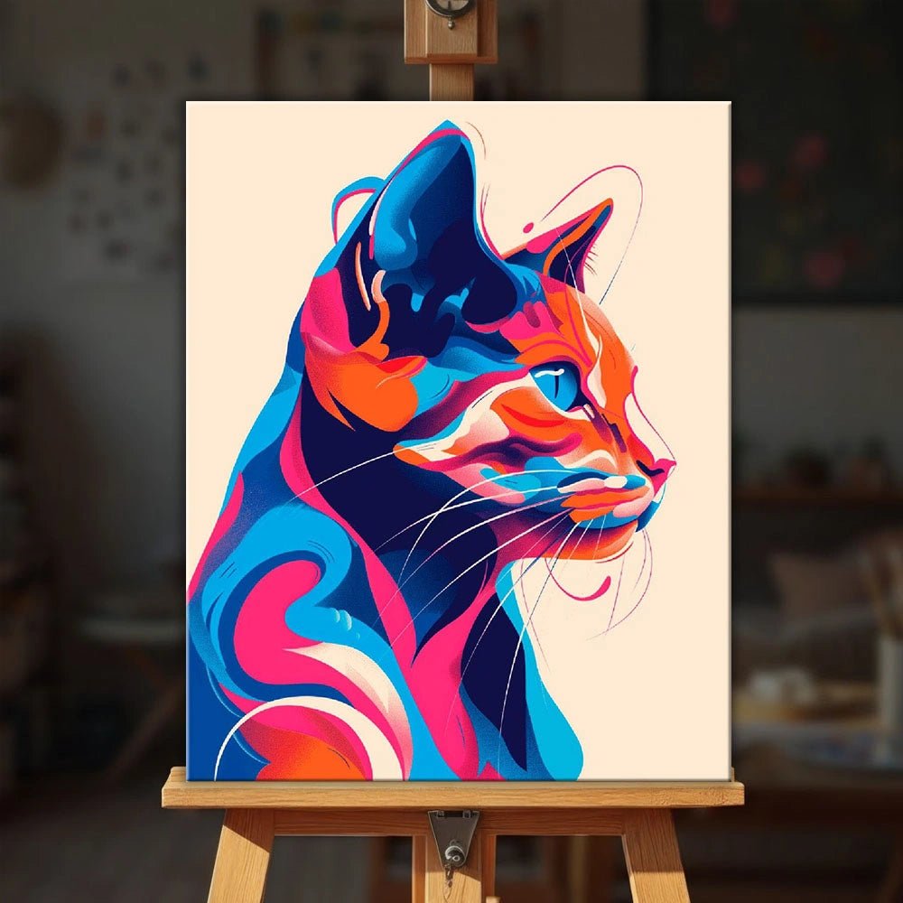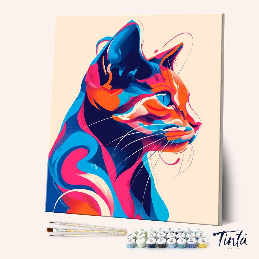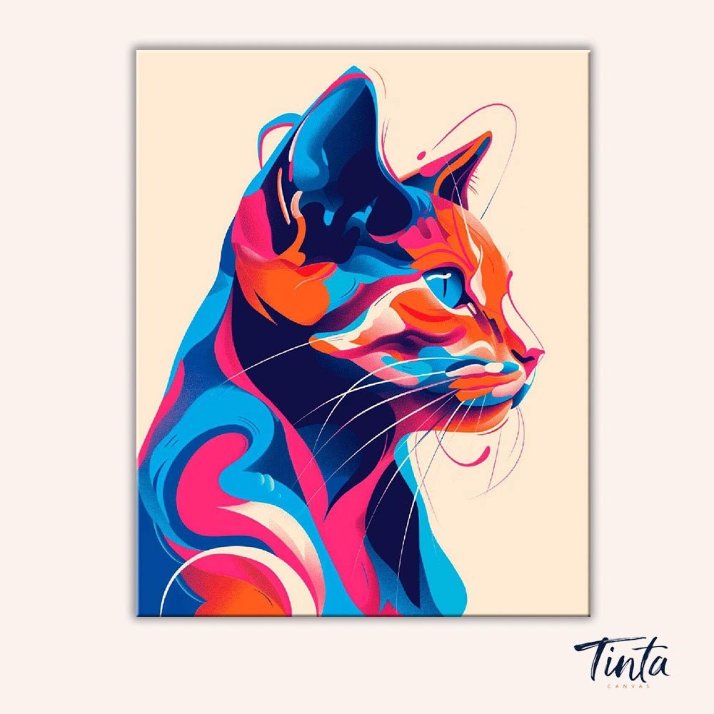 Colorful Whisker Muse es un moderno kit de pintura por números que presenta un impactante retrato de gato que cobra vida con formas fluidas y vibrantes capas de color. Azules intensos, naranjas cálidos y suaves tonos rosados se combinan para crear un perfil felino seguro y expresivo, artístico, tranquilo y lleno de personalidad.