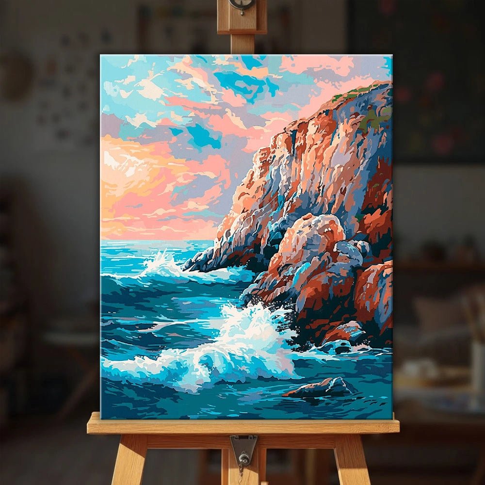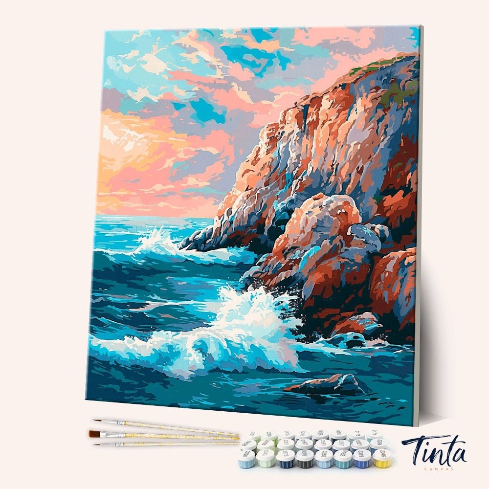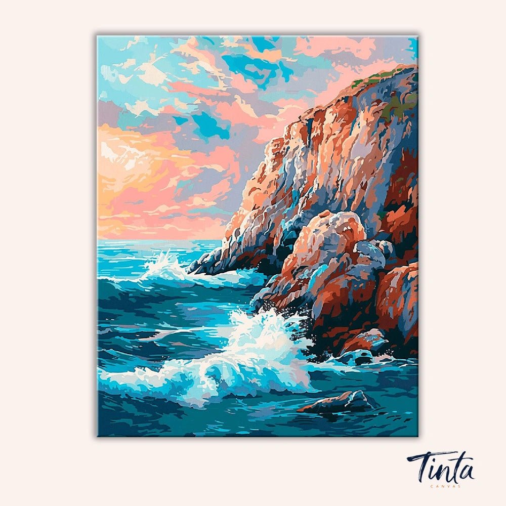 Acantilados de Marea Rompiente es un potente kit para pintar por números inspirado en la belleza natural del océano al encontrarse con la escarpada roca costera. Las olas rompen contra los acantilados iluminados por el sol, mientras que los suaves cielos pastel aportan equilibrio a la escena, creando una sensación a la vez dramática y relajante.
