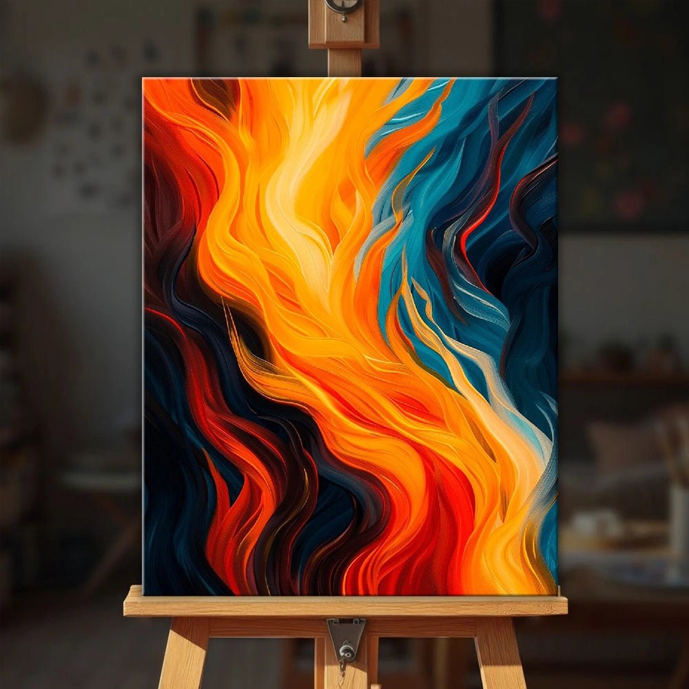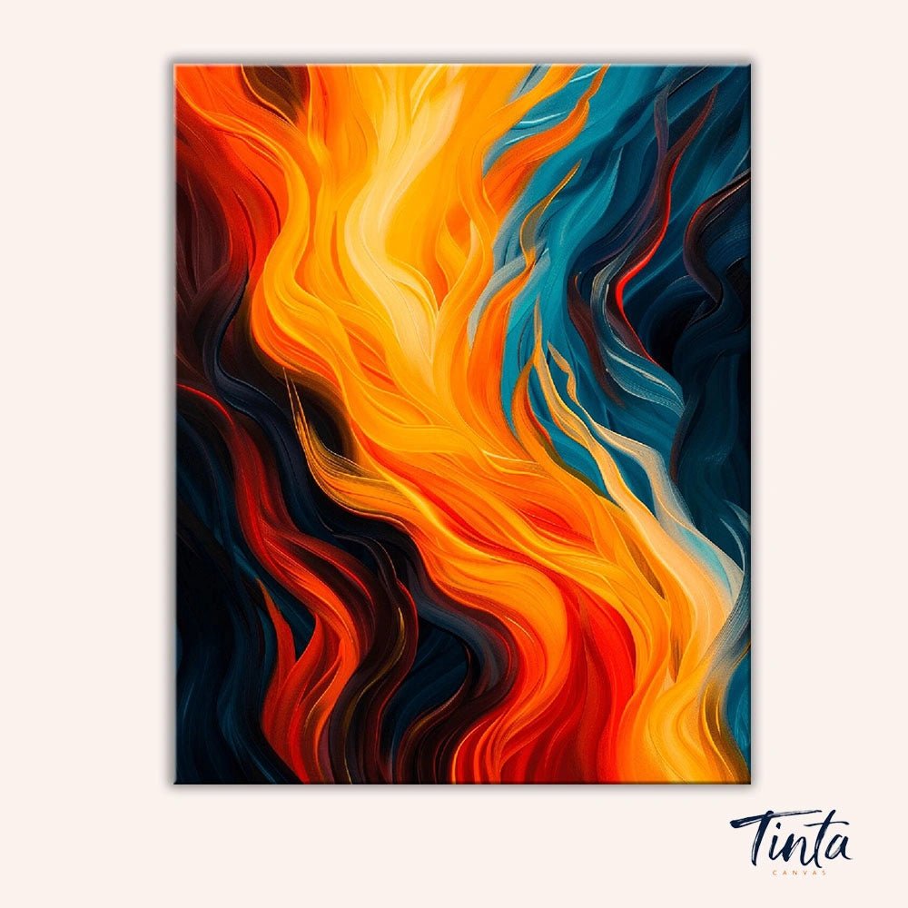 Este kit de pintura por números para adultos transforma las vibrantes franjas de fuego y el profundo azul del océano en una poderosa pintura abstracta. Dorados luminosos, naranjas fundidos y frescas corrientes verde azulado se combinan en un movimiento rítmico, similar a una llama, que resulta enérgico, moderno y profundamente satisfactorio de pintar.