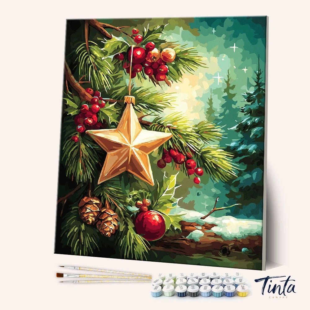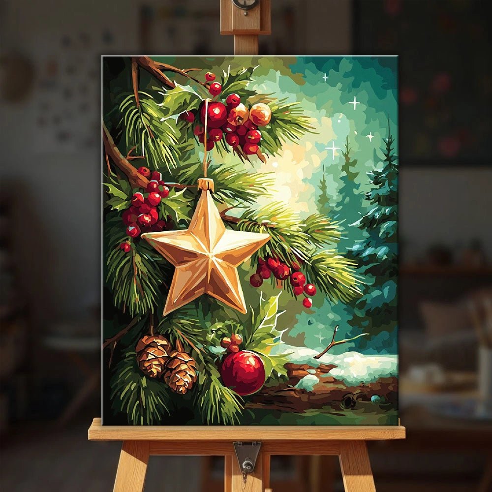 Este kit de pintura por números captura un tranquilo momento navideño, donde un adorno de estrella dorada cuelga delicadamente entre ramas de árboles perennes, piñas y bayas de invierno. La cálida luz se filtra a través del bosque, creando una escena serena y nostálgica que transmite paz en lugar de ajetreo.