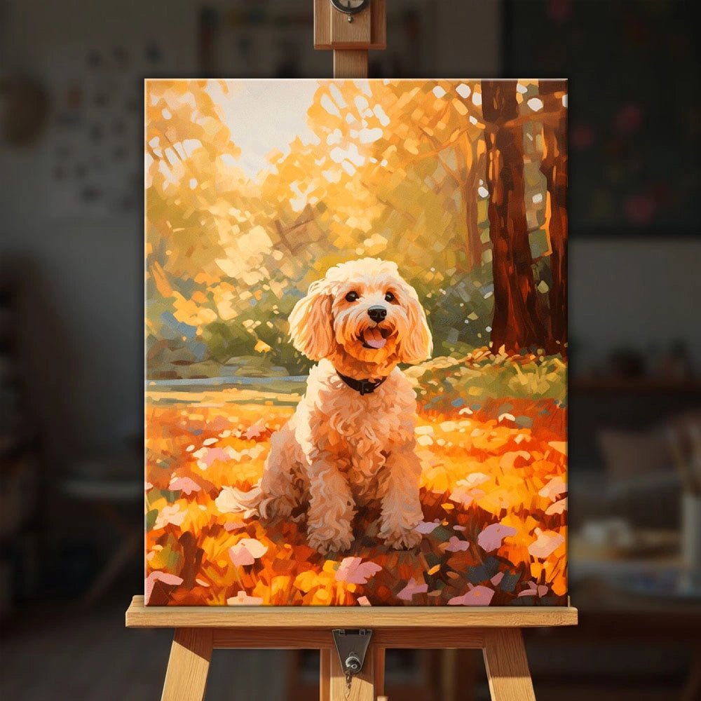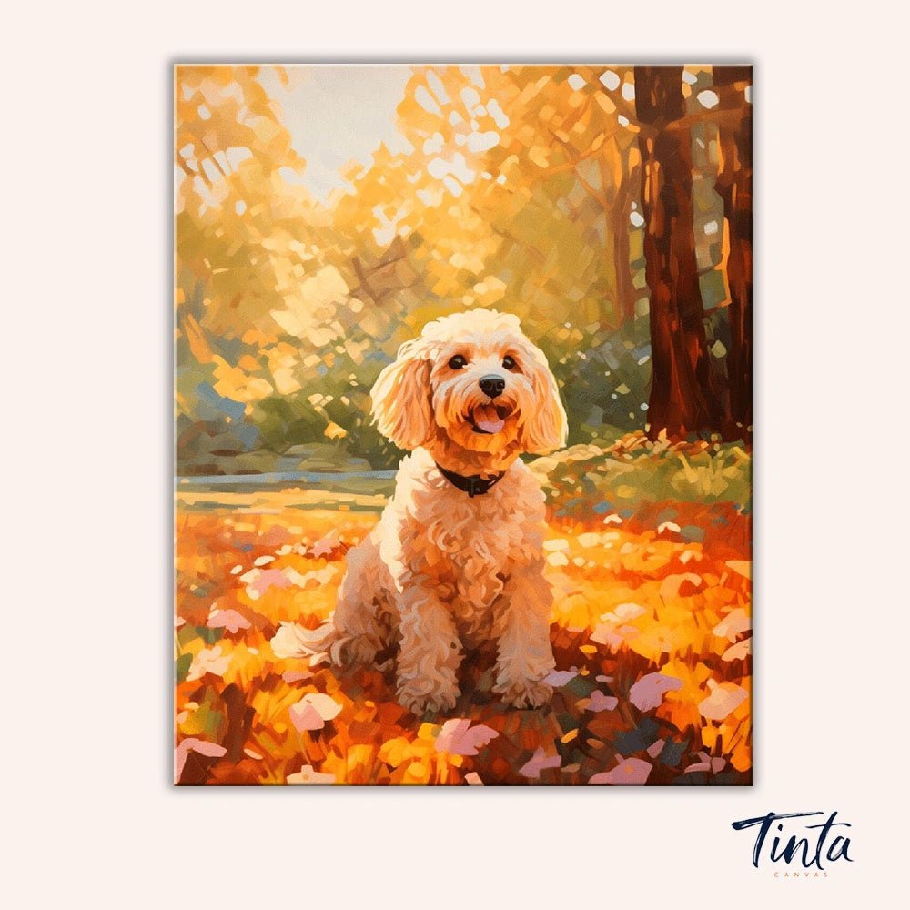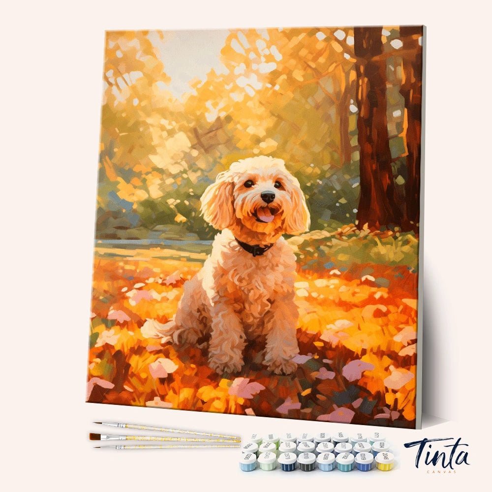 Golden Paws es un conmovedor kit para pintar por números que presenta a un perro peludo sentado plácidamente entre brillantes hojas otoñales. Los cálidos tonos dorados, las suaves texturas del pincel y la luz tenue crean una escena alegre, acogedora y llena de serena compañía.