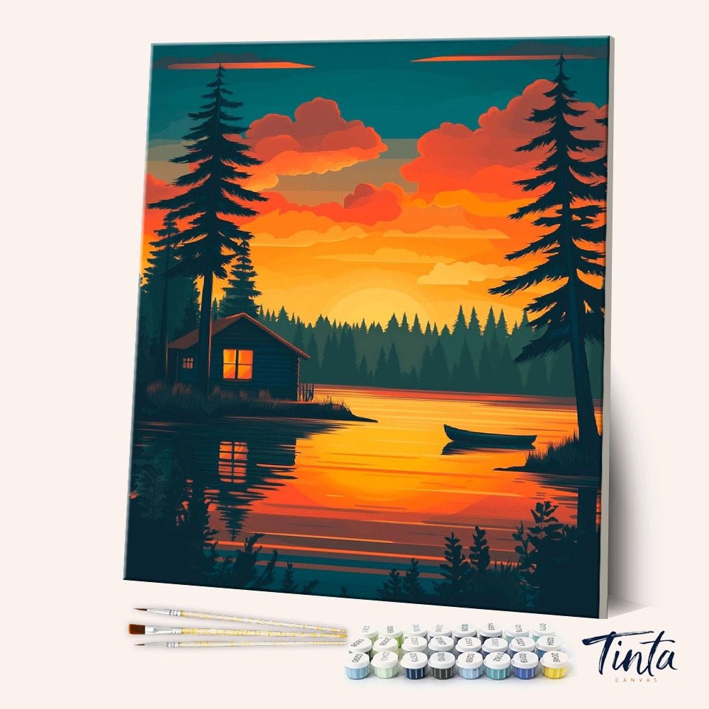 Aguas Tranquilas Doradas es un apacible kit de pintura por números para adultos inspirado en un tranquilo atardecer junto al lago. Una pequeña cabaña iluminada por una luz cálida, altos pinos y aguas tranquilas que reflejan el cielo dorado crean una escena serena, reconfortante y profundamente relajante.
