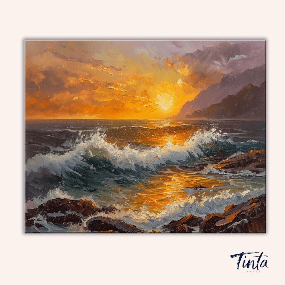 Este kit de pintura por números de un atardecer en el océano captura el imponente oleaje, iluminado por una luz dorada mientras el sol se esconde en el horizonte. Intensos reflejos ámbar brillan sobre el agua, mientras que los azules profundos y los tonos carbón añaden movimiento y profundidad, creando una experiencia pictórica expresiva y equilibrada.