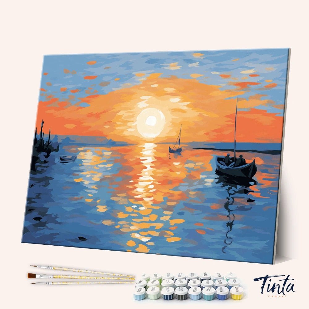Este kit de pintura por números para adultos captura un atardecer resplandeciente que se funde con aguas tranquilas, donde la suave luz naranja se funde con profundos reflejos azules. Los barcos flotan tranquilamente sobre la superficie al ponerse el sol, creando una experiencia de pintura serena, lenta, meditativa y de un equilibrio perfecto.
