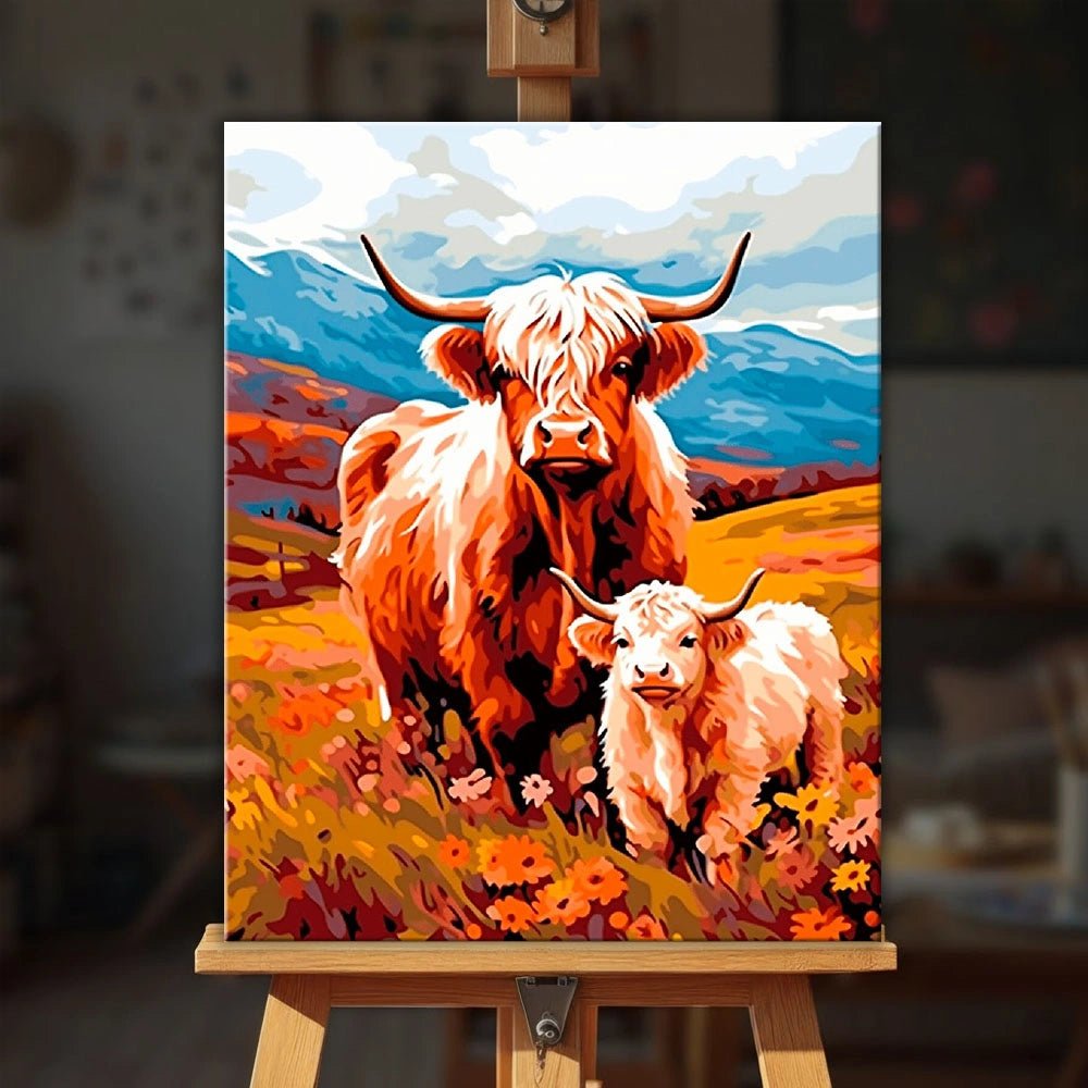 Este kit de pintura por números presenta una tierna vaca de las Highlands y su cría, juntas en un campo de flores silvestres, rodeadas de ondulantes colinas y un suave cielo de montaña. Los cálidos tonos óxido, los blancos cremosos y los intensos colores otoñales crean una experiencia de pintura reconfortante, plena, serena y profundamente satisfactoria.