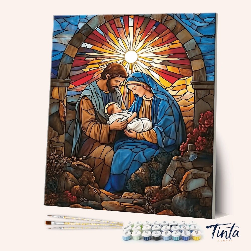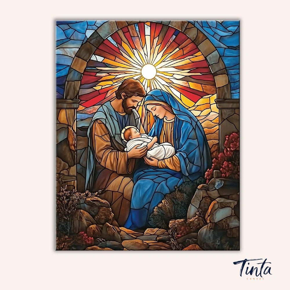 Este kit para pintar por números captura un momento sereno y sagrado en el que María y José acunan al recién nacido bajo la radiante luz de un vitral. Azules suaves, dorados cálidos y delicados tonos tierra se combinan para crear una escena que transmite paz, intimidad y profunda reverencia.