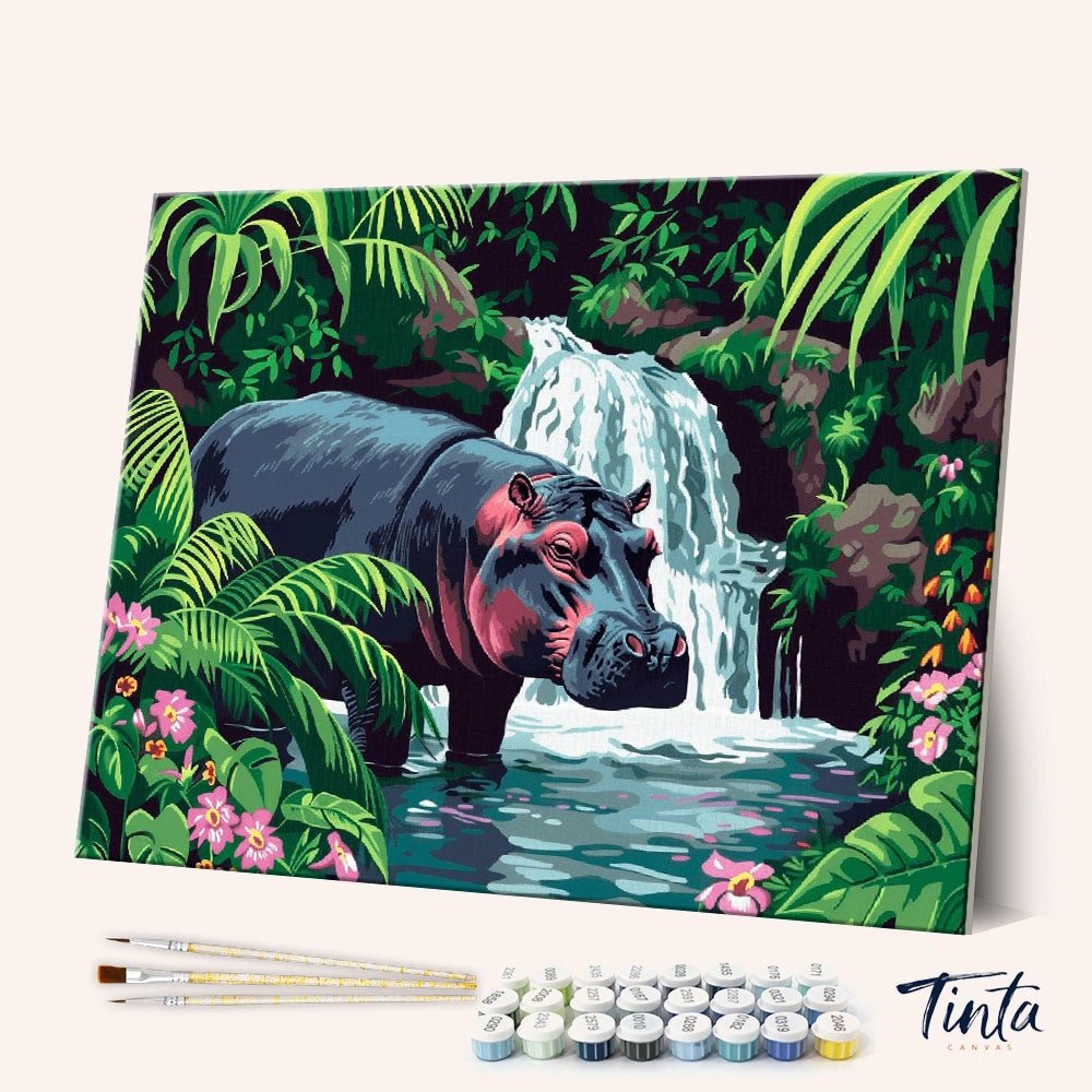 Este kit de pintura por números captura un hipopótamo tranquilo y apacible bajo una cascada escondida en la selva, rodeado de exuberantes hojas verdes y suaves flores rosas. Los tonos esmeralda intensos se combinan con azules agua fríos y suaves reflejos, creando una fluidez de pintura relajante de principio a fin.