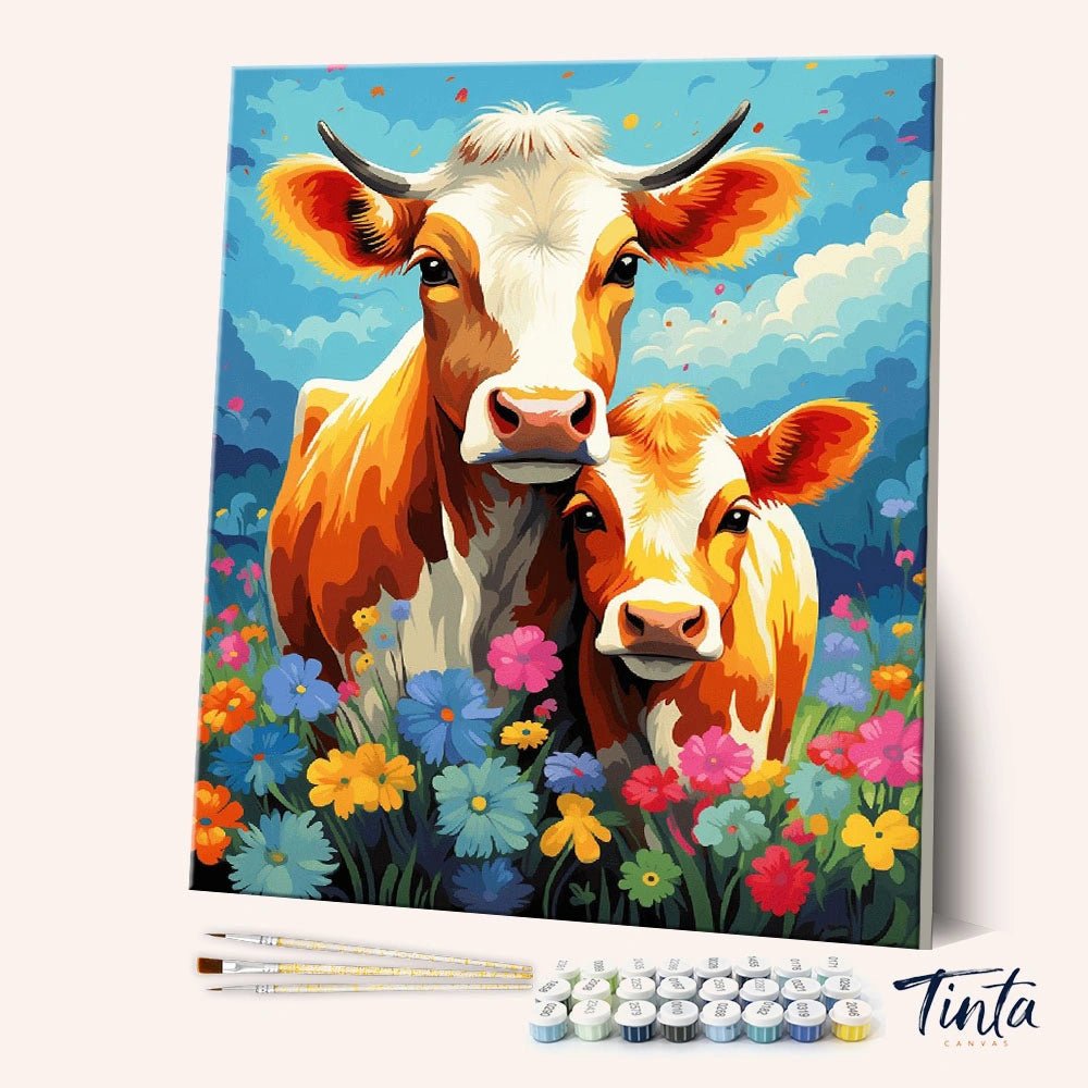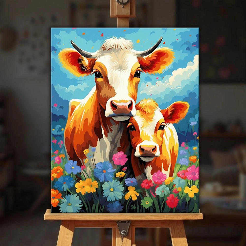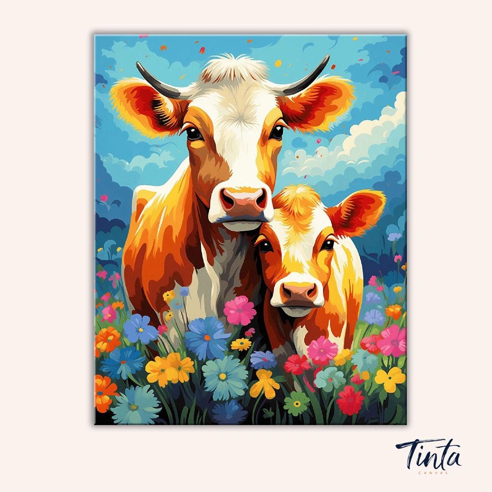 Meadow Duo es un alegre kit de pintura por números para adultos que presenta una tierna vaca y un ternero juntos en un campo de coloridas flores silvestres. Bajo un cielo radiante, esta conmovedora escena captura la sensación de cercanía, calidez y la tranquilidad de la vida rural.