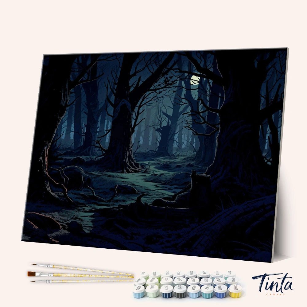 Inspirado en la naturaleza nocturna y los paisajes atmosféricos, Bosque de Medianoche transforma un oscuro entorno boscoso en una elegante obra de arte mural. Este kit de pintura por números para adultos es perfecto para interiores con un toque melancólico, amantes de la fantasía o cualquier persona atraída por escenas nocturnas tranquilas y cinematográficas.