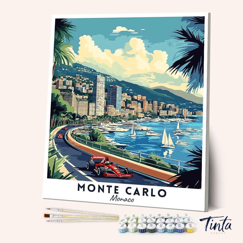 Experimenta el glamour de la Riviera Francesa con este kit de pintura por números para pósteres de viaje de Montecarlo. La obra captura la icónica curva costera de Montecarlo, los yates de lujo en el puerto, el paisaje urbano en la ladera y la emoción de un Fórmula 1 corriendo por la carretera costera.