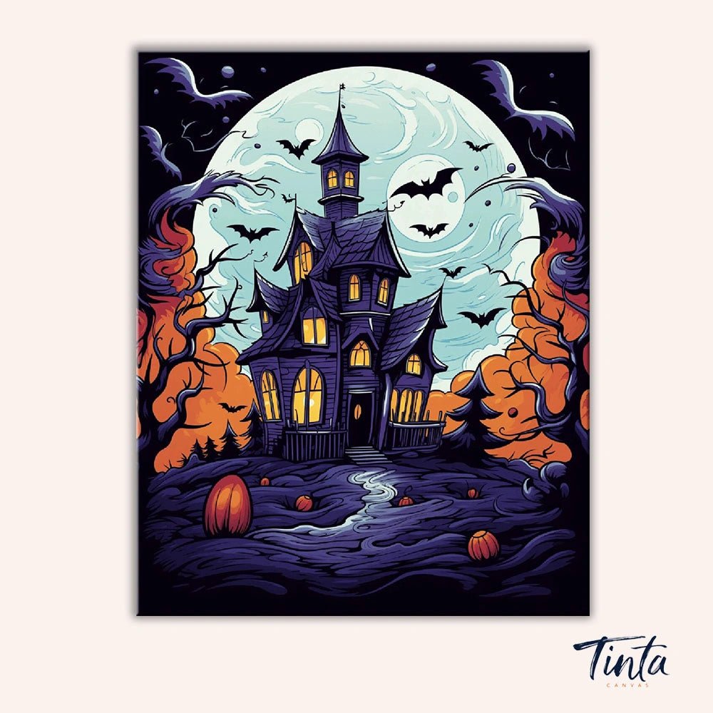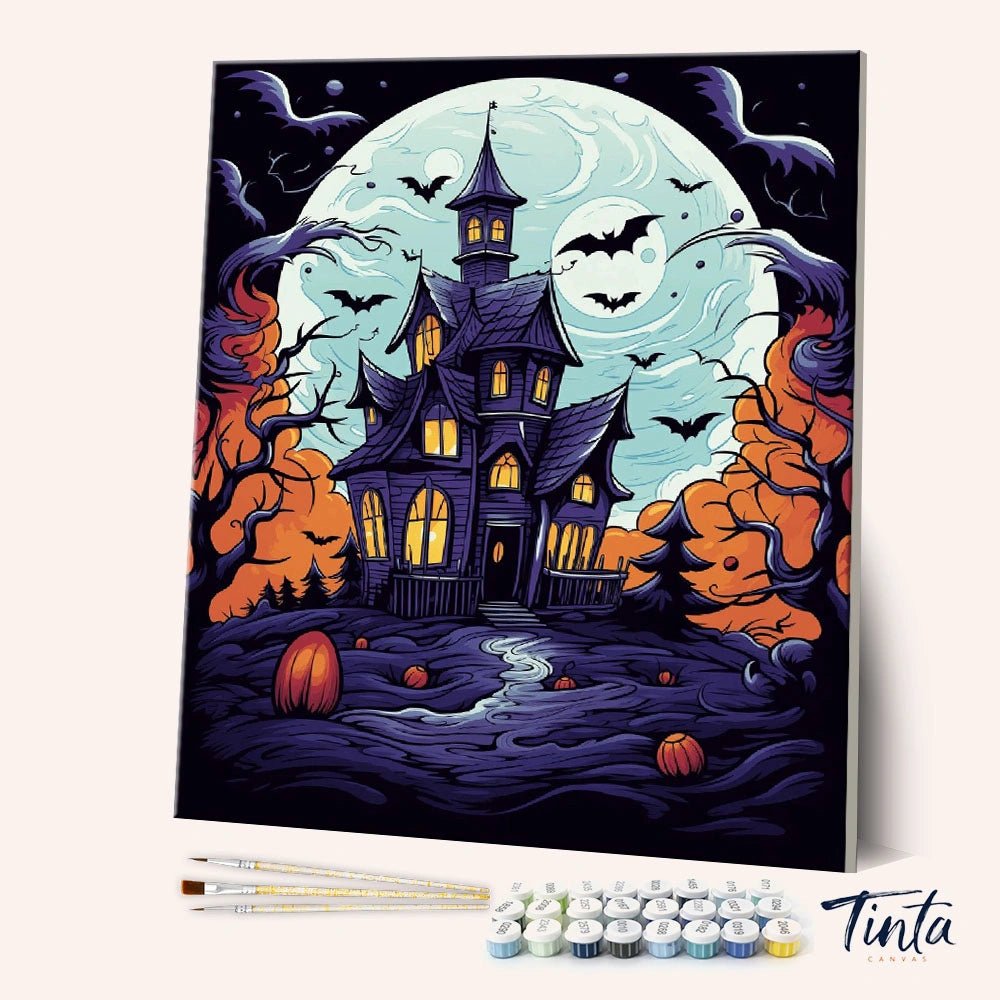 Este kit para pintar por números "Mansión Iluminada por la Luna" presenta una evocadora casa de estilo victoriano bajo la brillante luna llena, con murciélagos revoloteando, árboles retorcidos y calabazas dispersas a lo largo de un sendero sinuoso. Los intensos púrpuras medianoche se combinan con la cálida luz de las ventanas y los suaves azules de la luna, creando una fluidez dramática y fluida que resulta evocadora sin ser demasiado compleja.