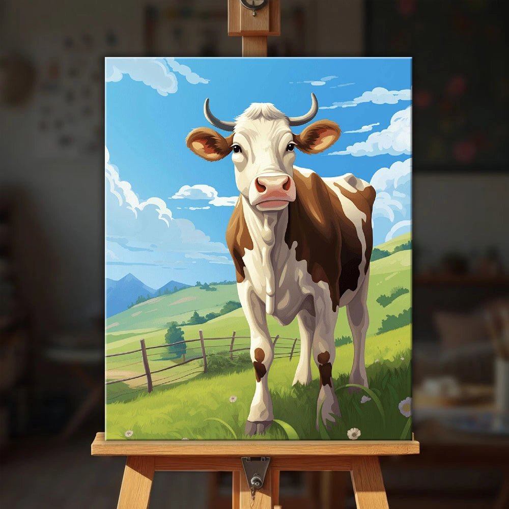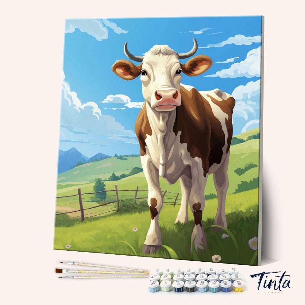 Pasture Calm es un relajante kit de pintura por números para adultos, inspirado en la serena belleza del campo abierto. Una mansa vaca en un prado verde y soleado, con suaves colinas a lo lejos y un cielo azul suave, crea una escena que transmite paz, tranquilidad y tranquilidad.