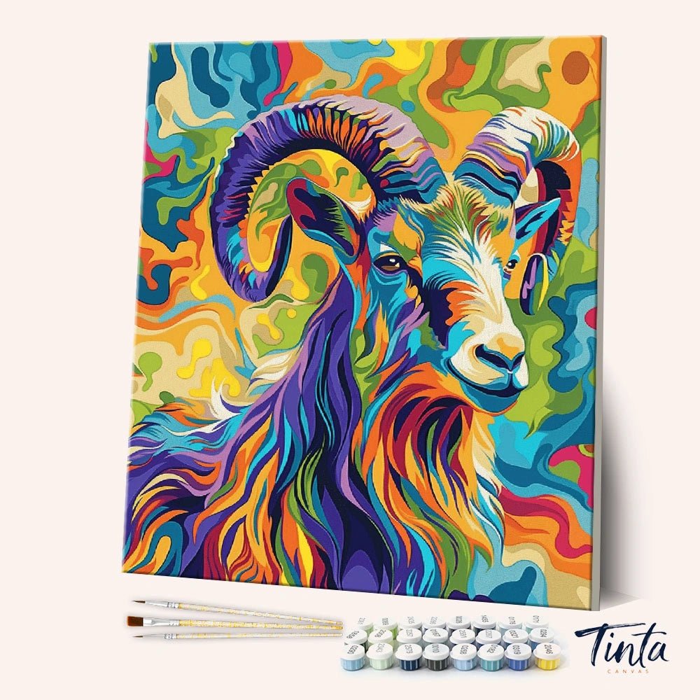 Carnero Prismático es un audaz kit para pintar por números que presenta un poderoso carnero que cobra vida mediante formas fluidas y trazos vibrantes y multicolores. Los expresivos cuernos y las texturas en capas transmiten fuerza, confianza y energía creativa.