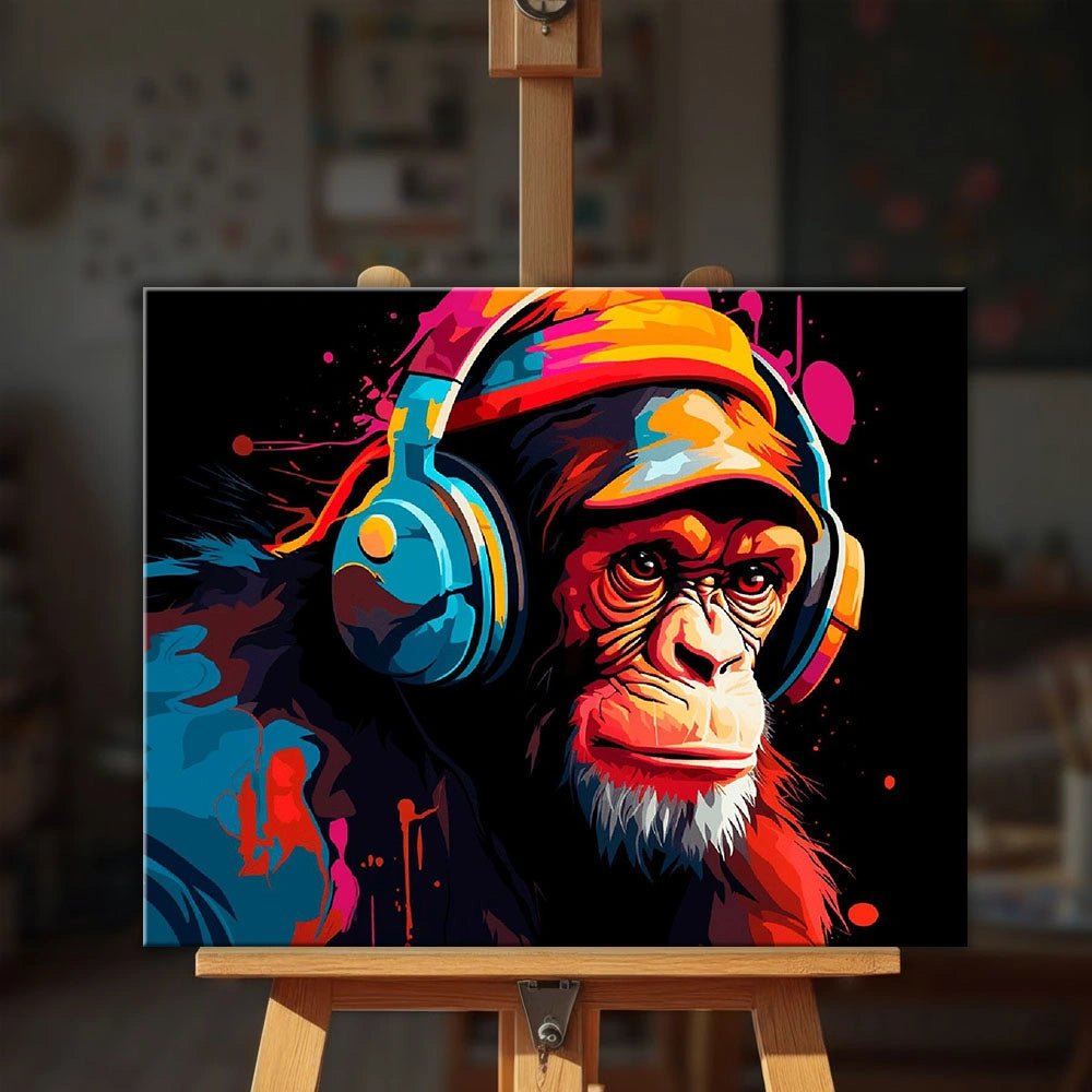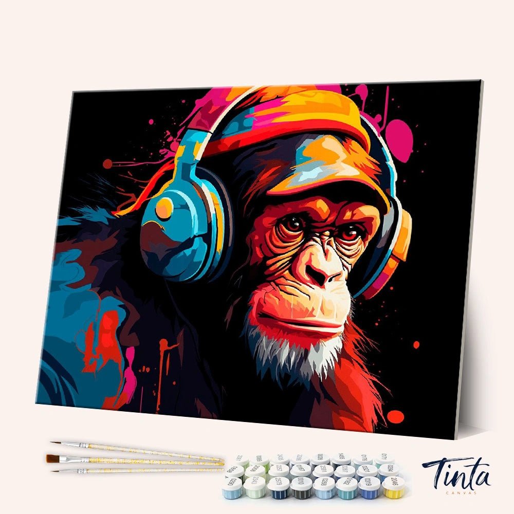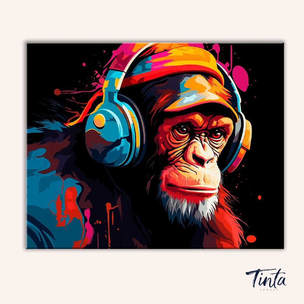 Colores vibrantes, líneas definidas y una actitud lúdica se unen en este impactante kit de pintura por números. Un mono genial, absorto en la música con auriculares enormes, destaca sobre un fondo negro intenso salpicado de vibrantes rojos, azules y acentos eléctricos. Pintar esta pieza transmite energía y expresividad, con cada sección fluyendo con naturalidad hacia la siguiente.