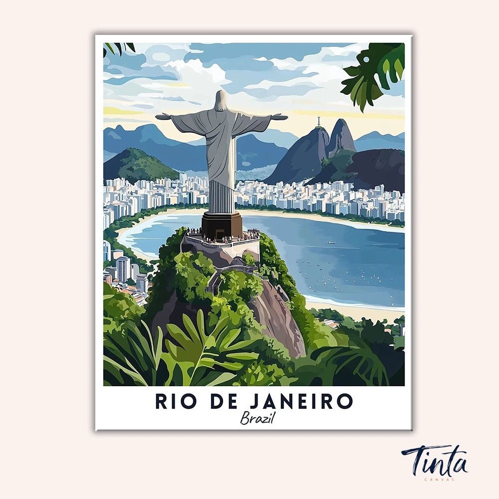 Este kit para pintar por números de carteles turísticos de Río de Janeiro muestra la icónica estatua del Cristo Redentor con vistas a la extensa costa, las exuberantes colinas y las cristalinas aguas de la Bahía de Guanabara. El mirador elevado captura la energía, la naturaleza y el inconfundible horizonte de Río en una escena impactante.