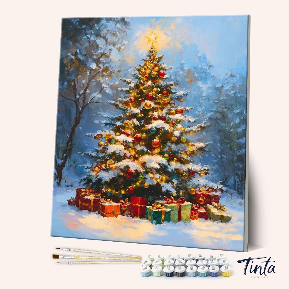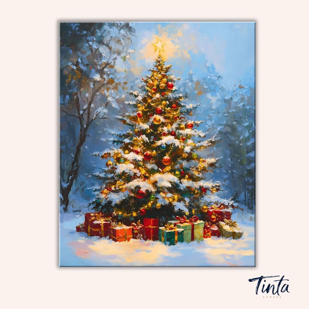 Este kit de pintura por números captura una apacible tarde de invierno, donde un árbol de Navidad suavemente iluminado brilla contra la nieve recién caída y un cielo azul sereno. Luces doradas, adornos clásicos y una suave nevada crean una escena navideña serena, cálida, nostálgica y sin prisas.
