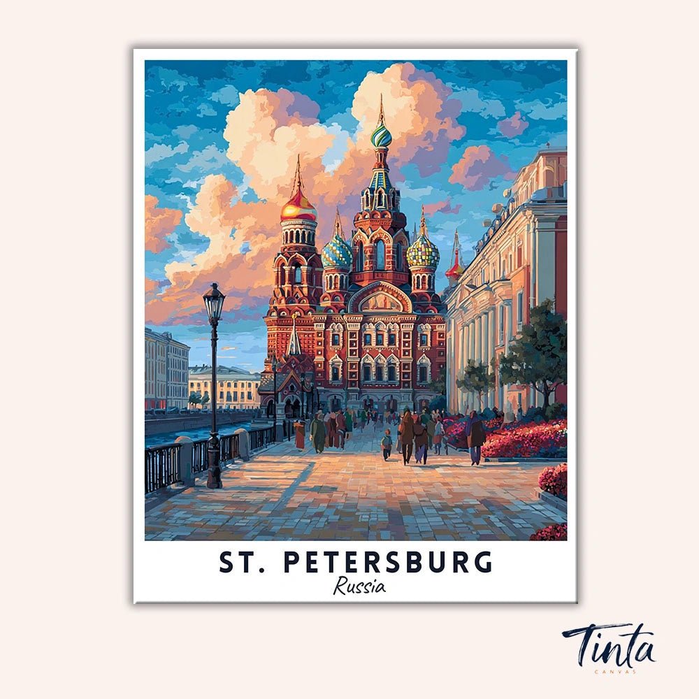 Este kit de pintura por números de pósteres de viaje de San Petersburgo resalta la icónica Iglesia del Salvador sobre la Sangre Derramada, que brilla bajo un espectacular cielo vespertino. Los ricos tonos joya, las cúpulas ornamentadas y los suaves reflejos de las calles crean una experiencia de pintura suave y relajante, detallada y accesible de principio a fin.