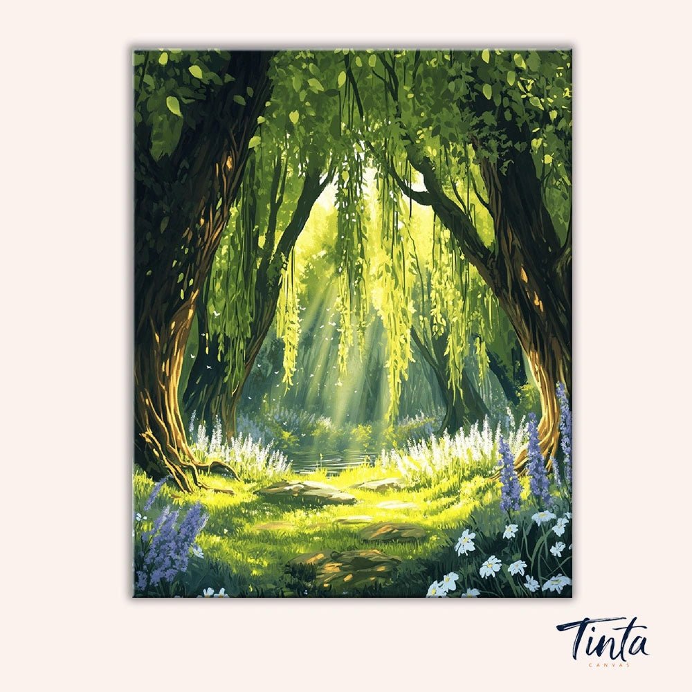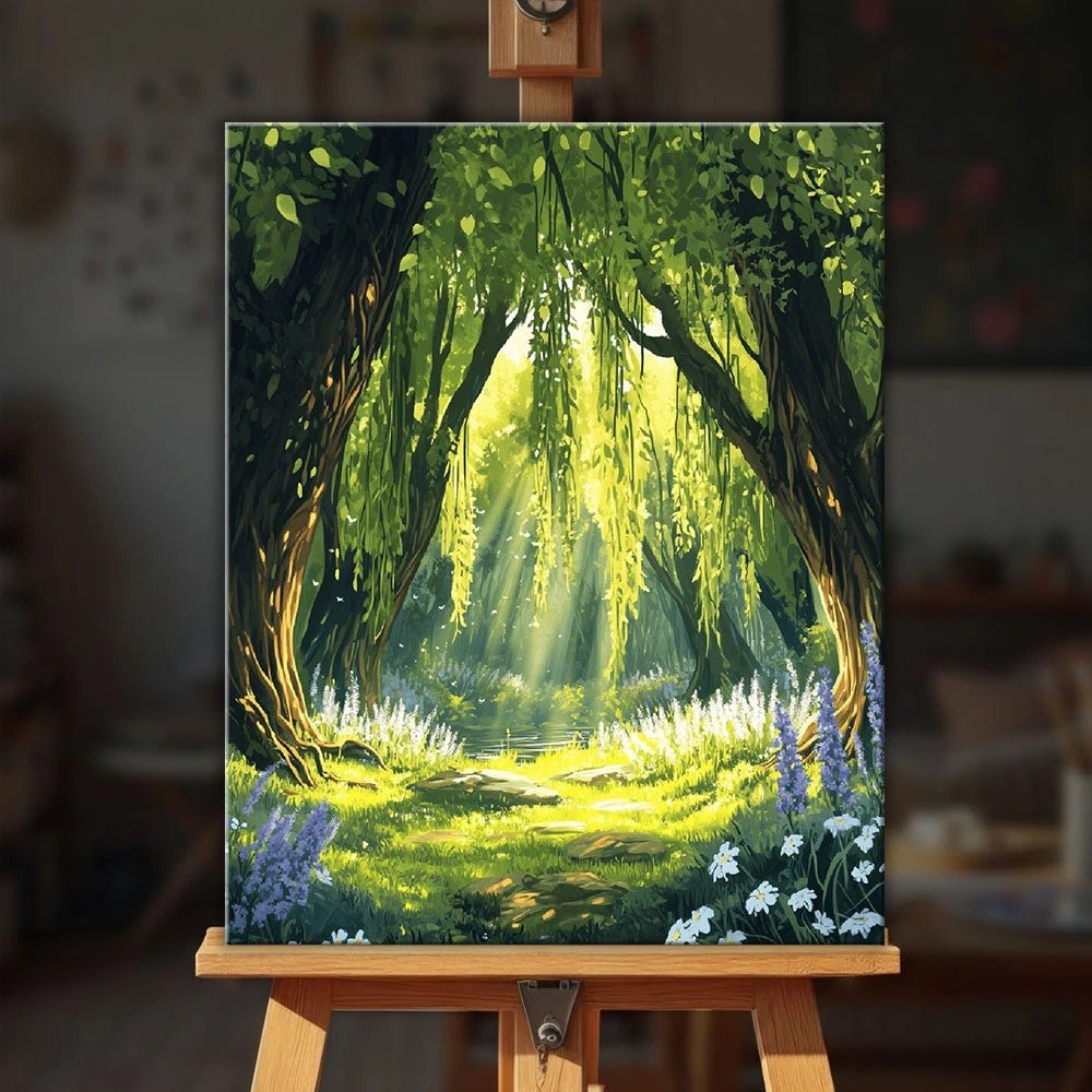 Este kit de pintura por números presenta un tranquilo claro del bosque donde la suave luz del sol se filtra a través de los árboles arqueados, iluminando la exuberante vegetación y las delicadas flores silvestres. Los verdes frescos, la cálida luz dorada y las suaves sombras crean una experiencia de pintura relajante que te sumerge de principio a fin.