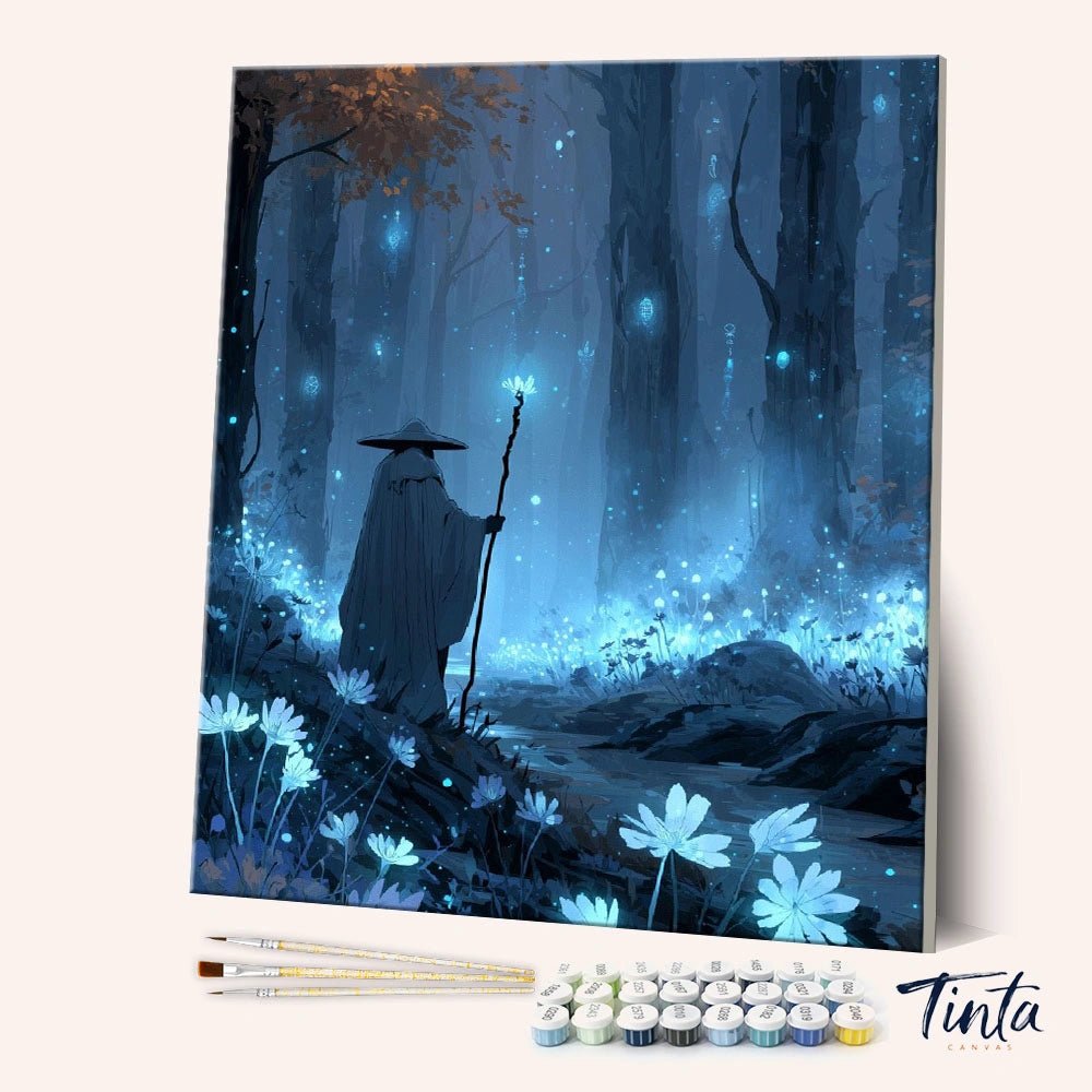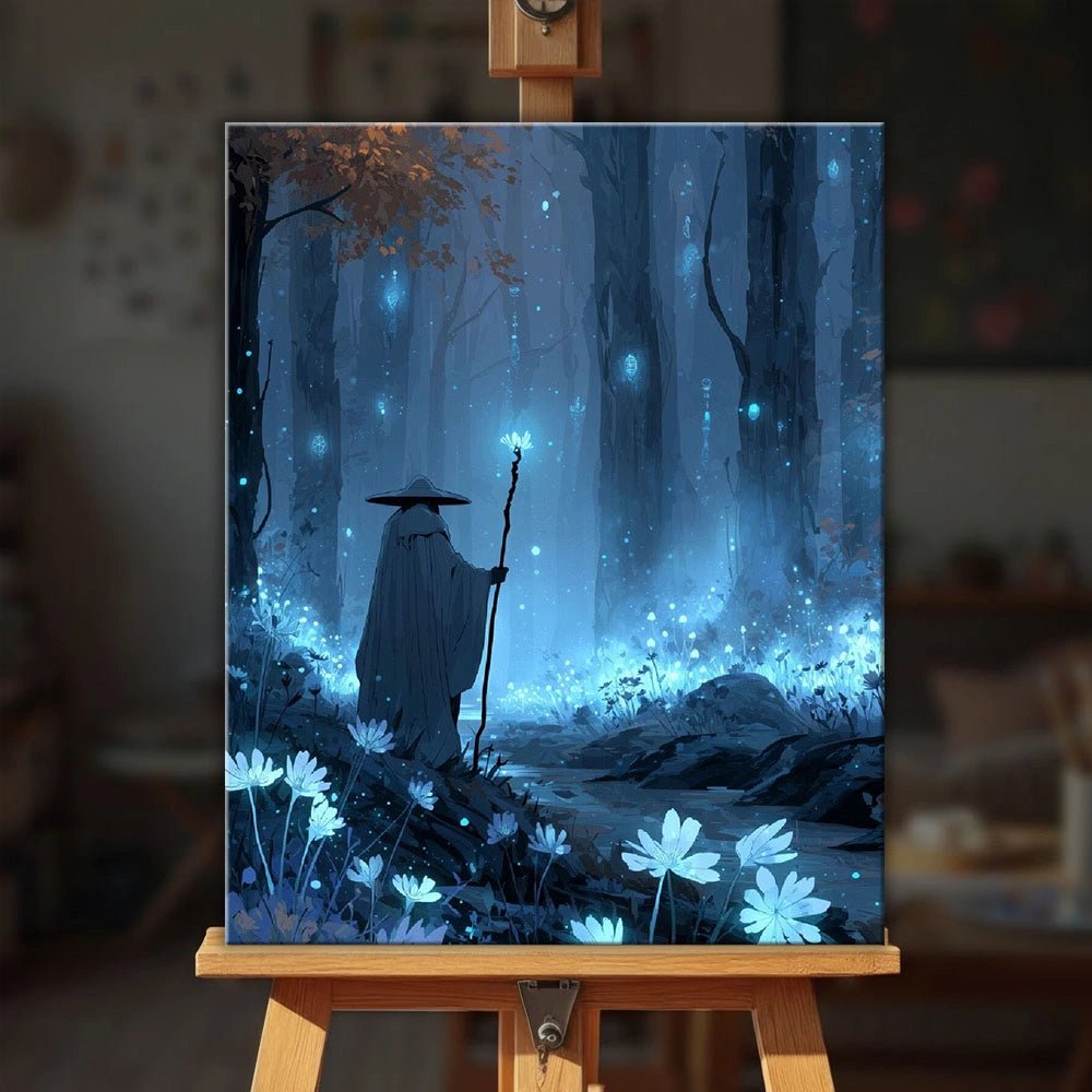 El Buscador de Caminos es un kit de pintura por números para adultos, tranquilo y atmosférico, inspirado en viajes tranquilos y guía interior. Un viajero solitario recorre un bosque resplandeciente, guiado por una suave luz azul, creando una escena apacible, misteriosa y profundamente reflexiva.