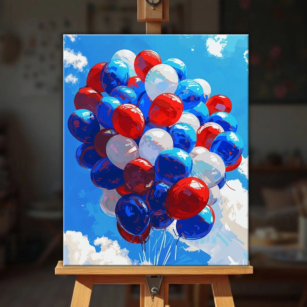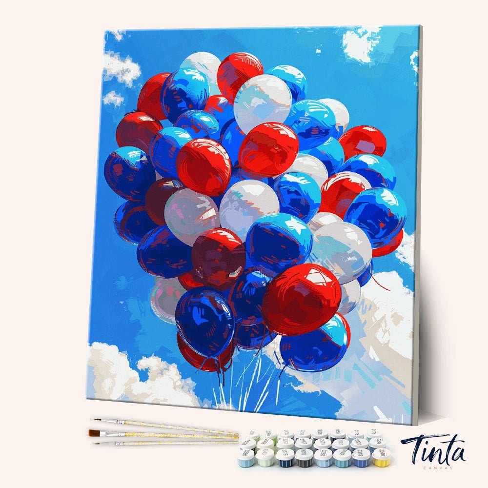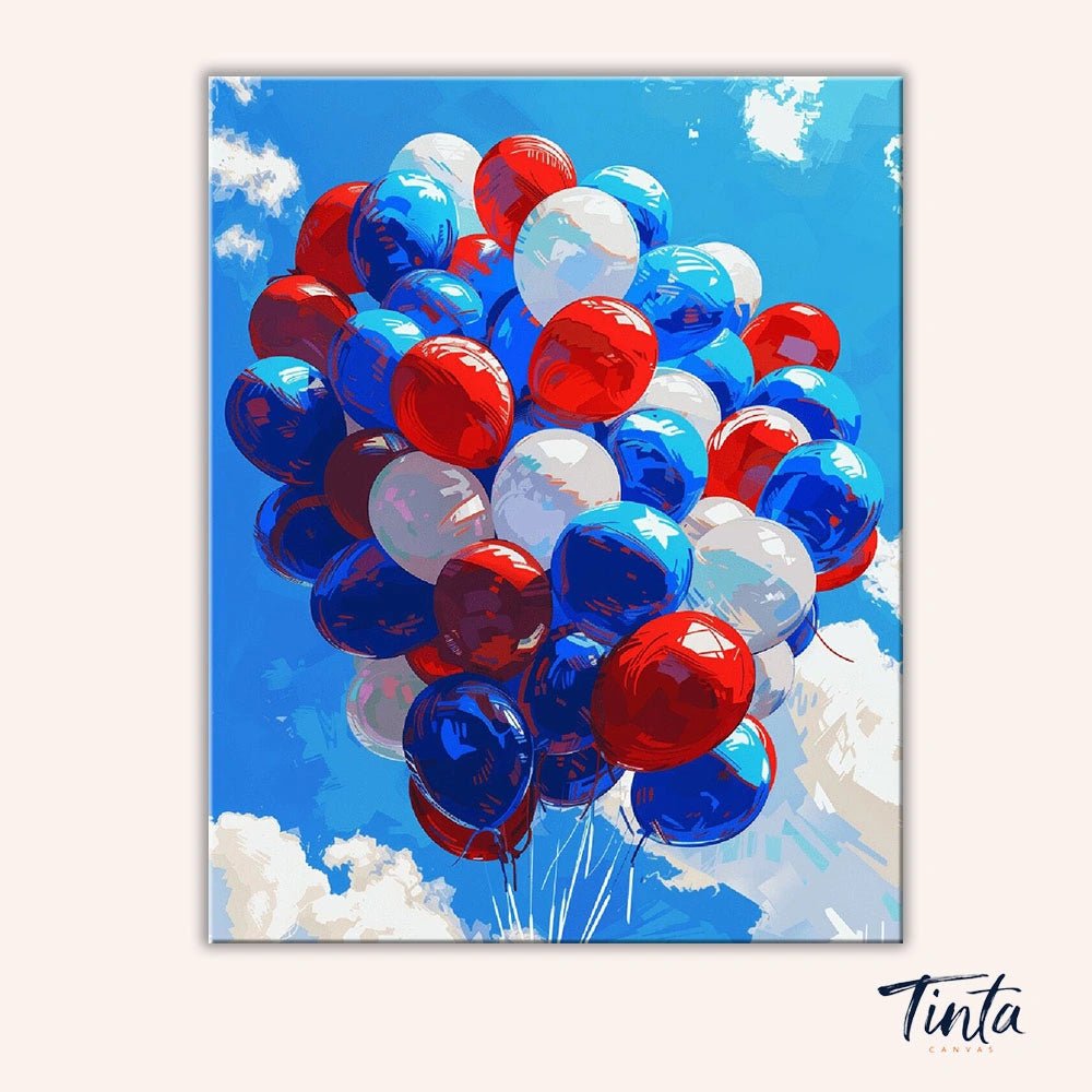 Up We Go es un alegre kit de pintura por números para adultos que presenta un grupo de brillantes globos rojos, blancos y azules que flotan en un cielo azul despejado. La escena se siente ligera, inspiradora y llena de movimiento, capturando ese simple momento de dejarse llevar y ver surgir algo hermoso.