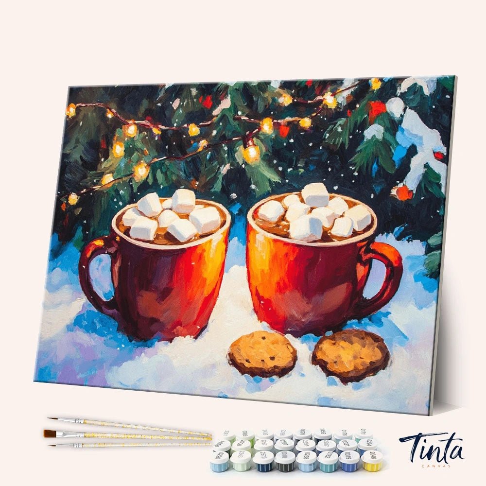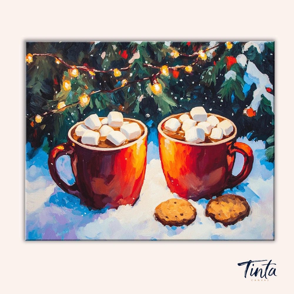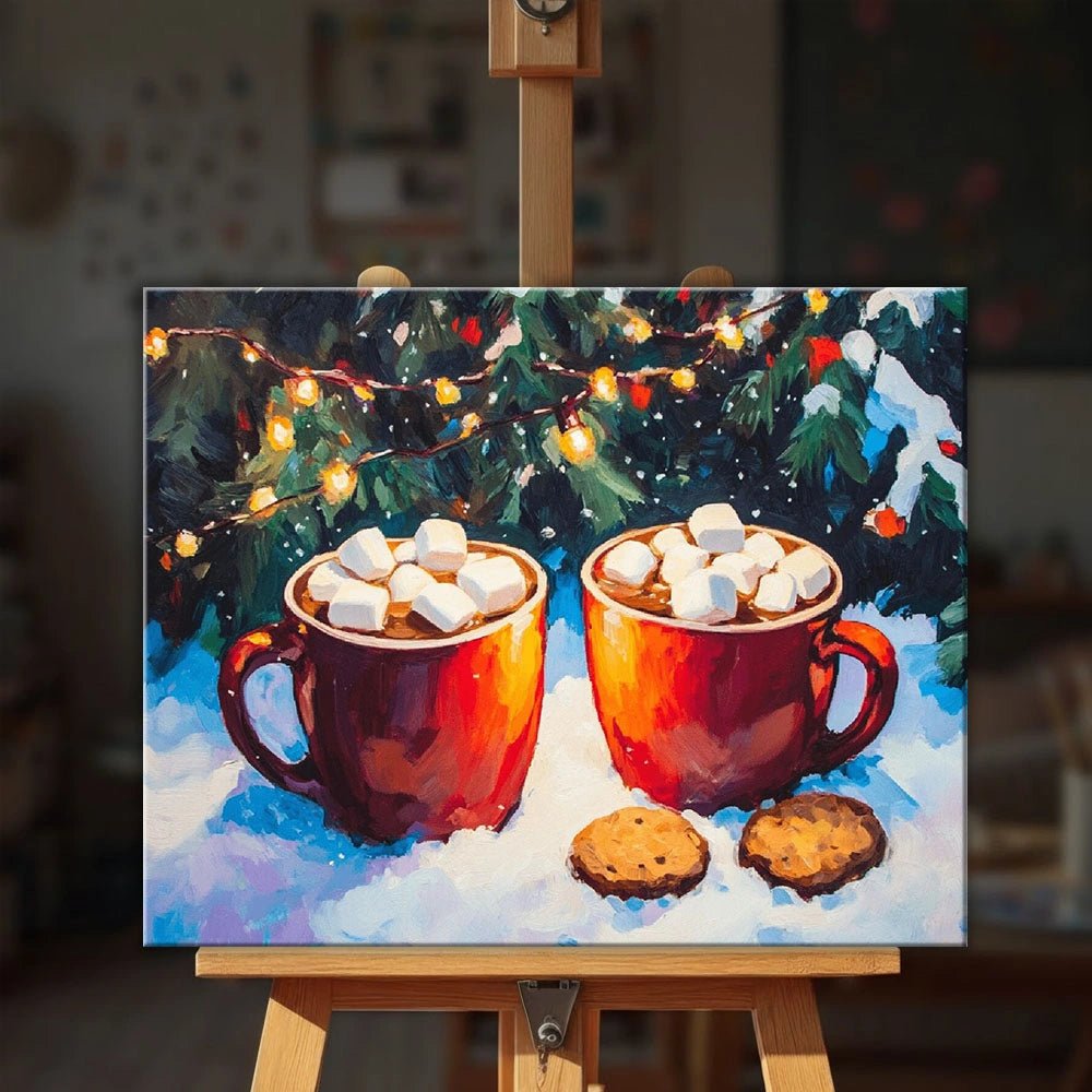 Este kit de pintura por números para adultos muestra dos tazas humeantes de chocolate caliente cubiertas con suaves malvaviscos, descansando sobre la nieve fresca bajo brillantes luces navideñas. Rojos cálidos, blancos cremosos y profundos tonos verdes crean una experiencia de pintura serena e íntima que se siente acogedora, nostálgica y discretamente romántica.