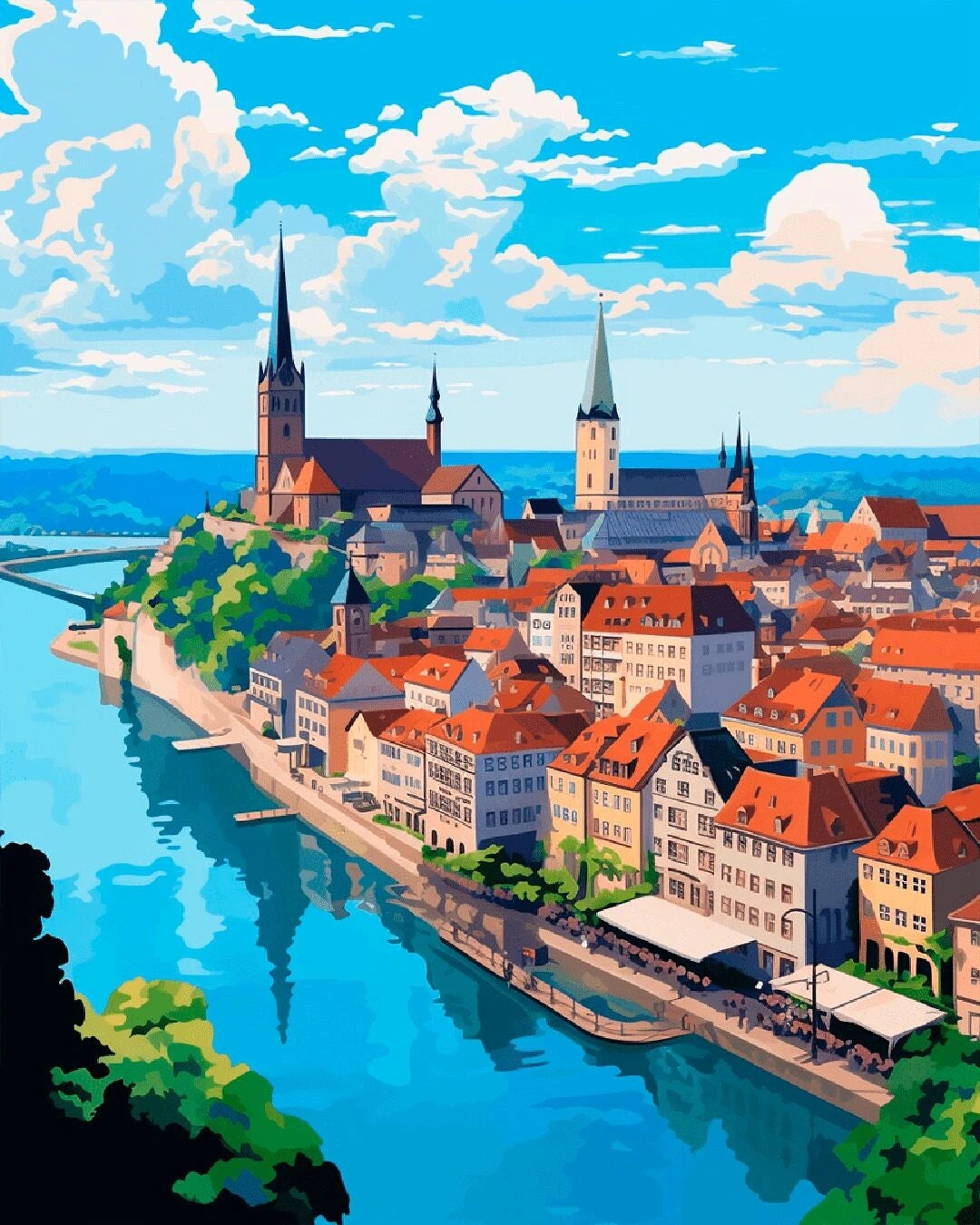 Seaside City Charm is a paint by numbers kit for adults that captures the beauty of a historic city nestled along calm blue waters. The balanced composition, repeating rooftops, and flowing river create a satisfying painting experience as each section comes together. The scene feels bright, structured, and visually inviting.