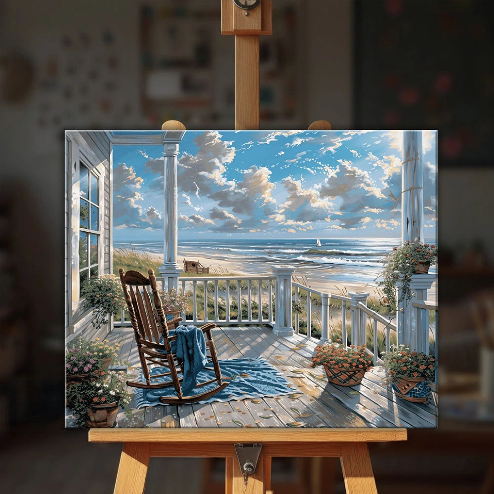 Seaside Overlook is a paint by numbers kit for adults that captures the quiet comfort of a coastal porch facing the open sea. The rocking chair, ocean breeze, and soft light create a peaceful painting experience where each numbered section builds a sense of calm and spaciousness. The finished artwork feels relaxed, airy, and timeless.