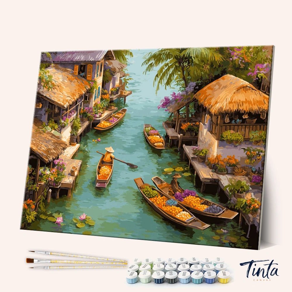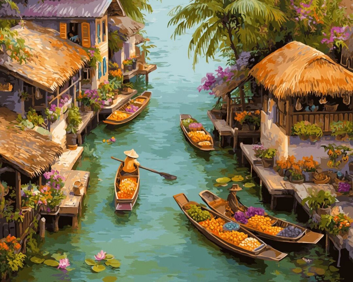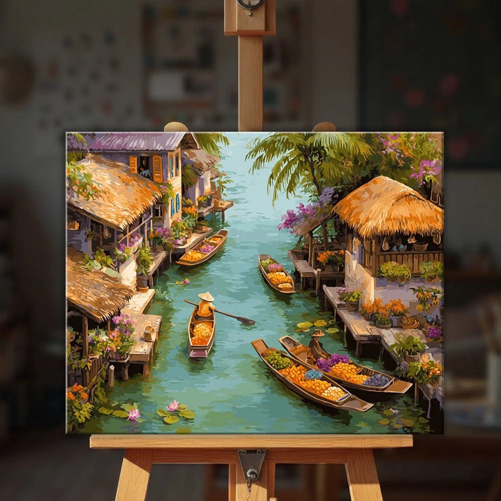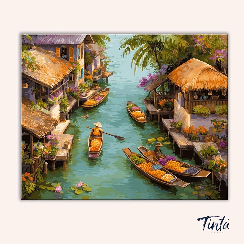 Boats drift gently through a narrow canal, carrying baskets of fruit beneath palm trees and thatched riverside homes. Soft reflections, warm colors, and lush greenery create a calm yet lively scene that captures the rhythm of daily life along the water.